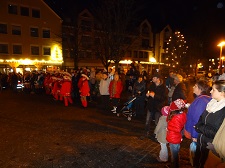 dem Fanfarenzug voran, vor das Rathaus. |